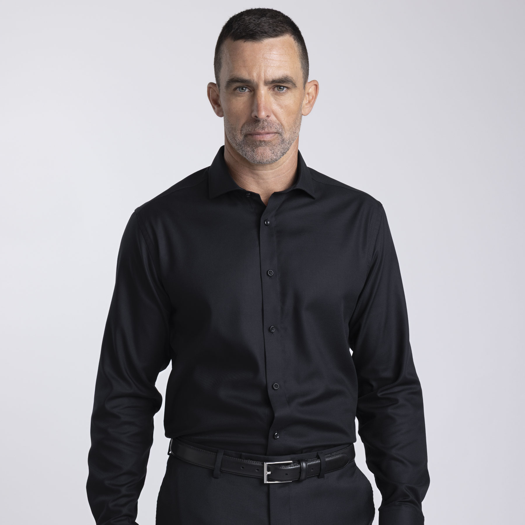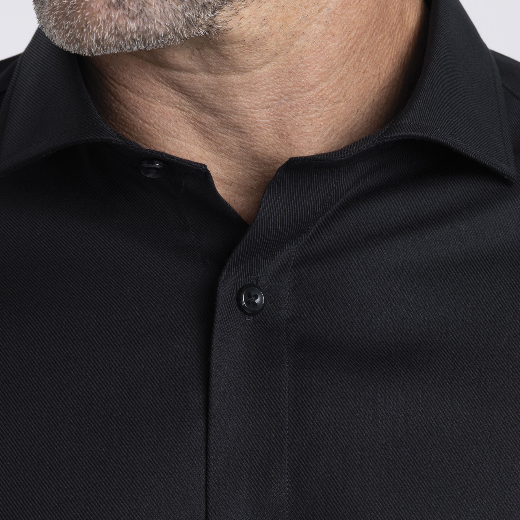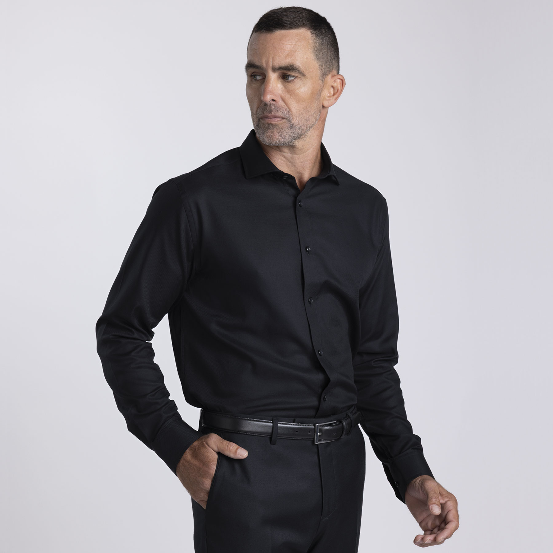 A sleek black cotton twill shirt with a modern tapered fit, finished with a luxury liquid ammonia treatment and non-wrinkle performance.