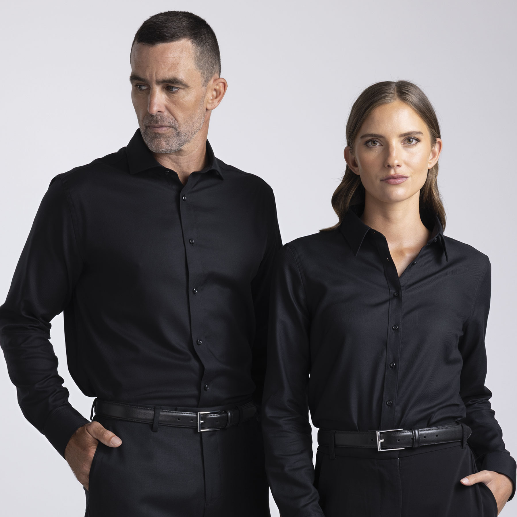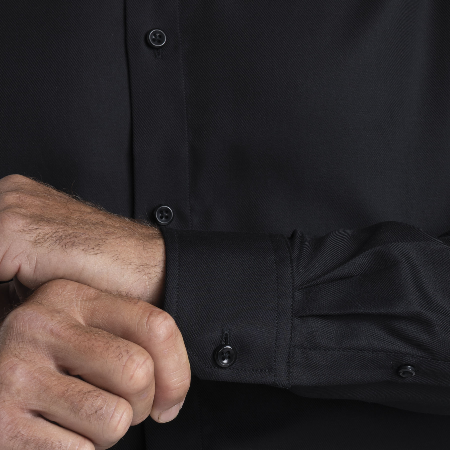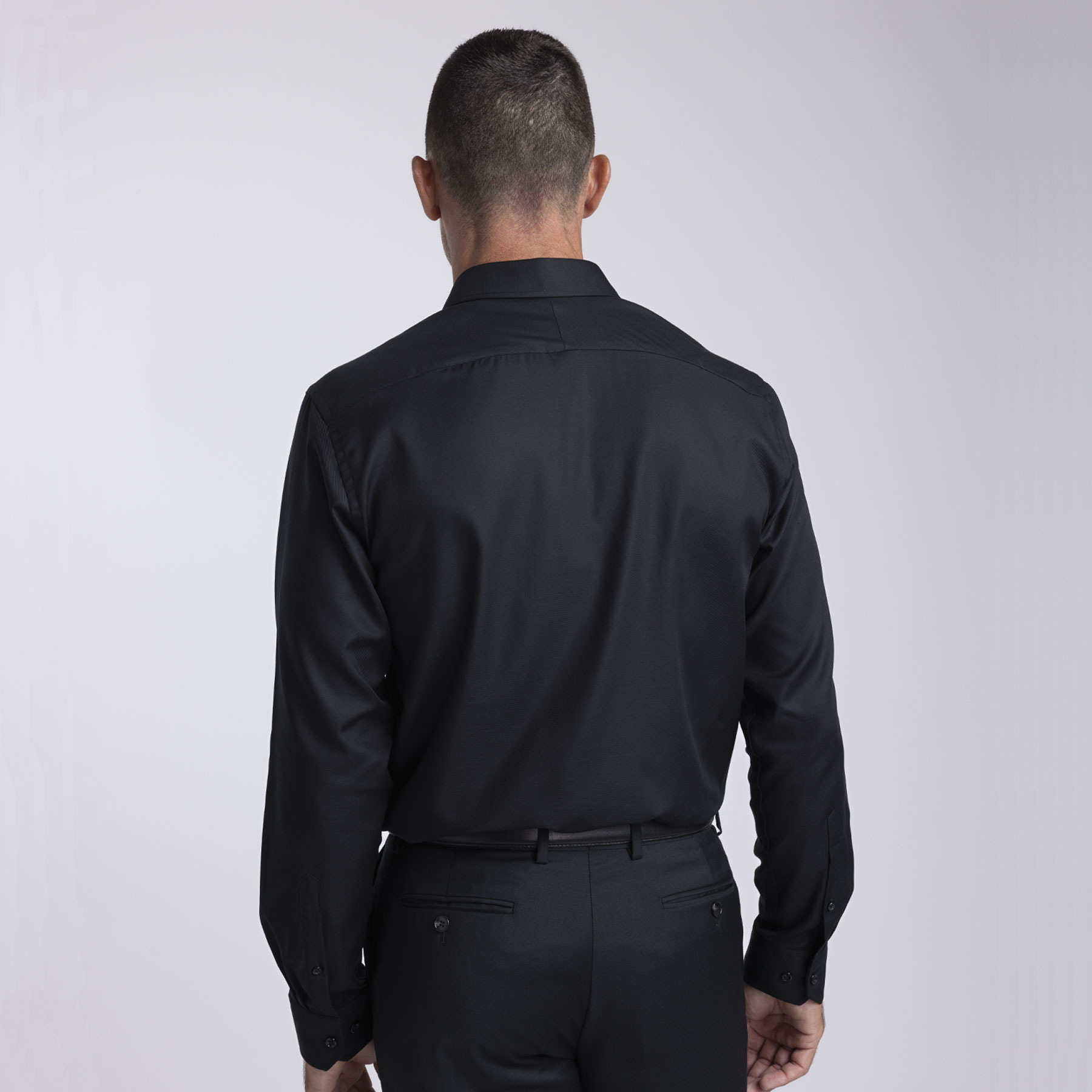 A sleek black cotton twill shirt with a modern tapered fit, finished with a luxury liquid ammonia treatment and non-wrinkle performance.